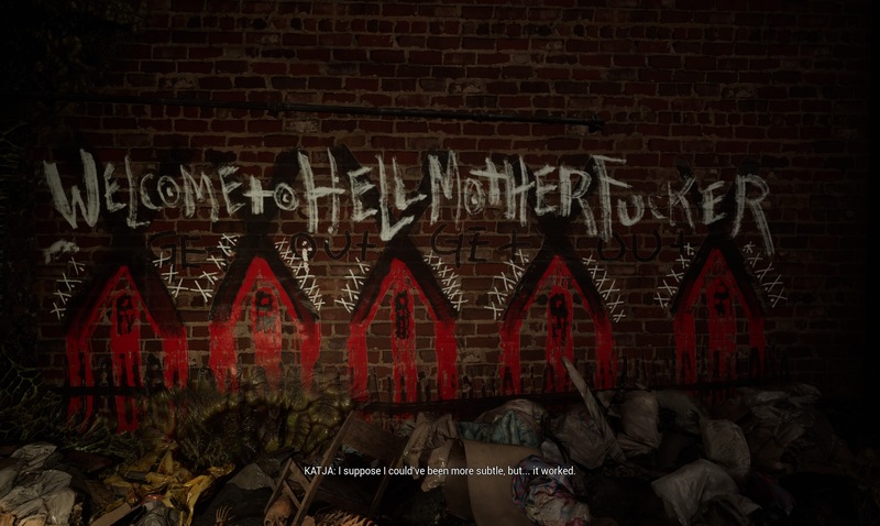 بازی با قرار دادن کاتیا در میان این گروهها، او را مجبور میکند تا راه خودش را پیدا کند. او نه به درد پناه میبرد، نه به ماشین و نه به نظم فاشیستی. او راهی میانبر را انتخاب میکند: راهی شخصی، لغزان و پر از درد و شک.